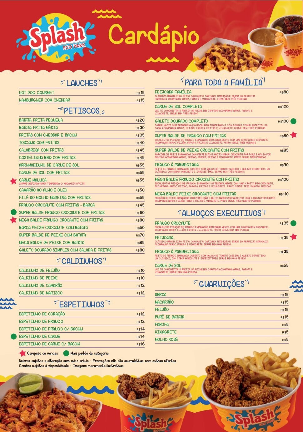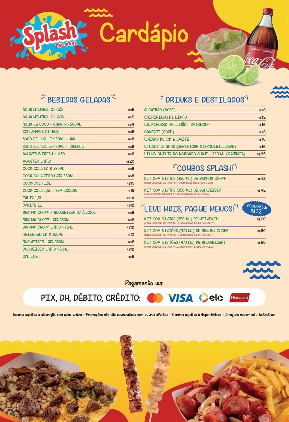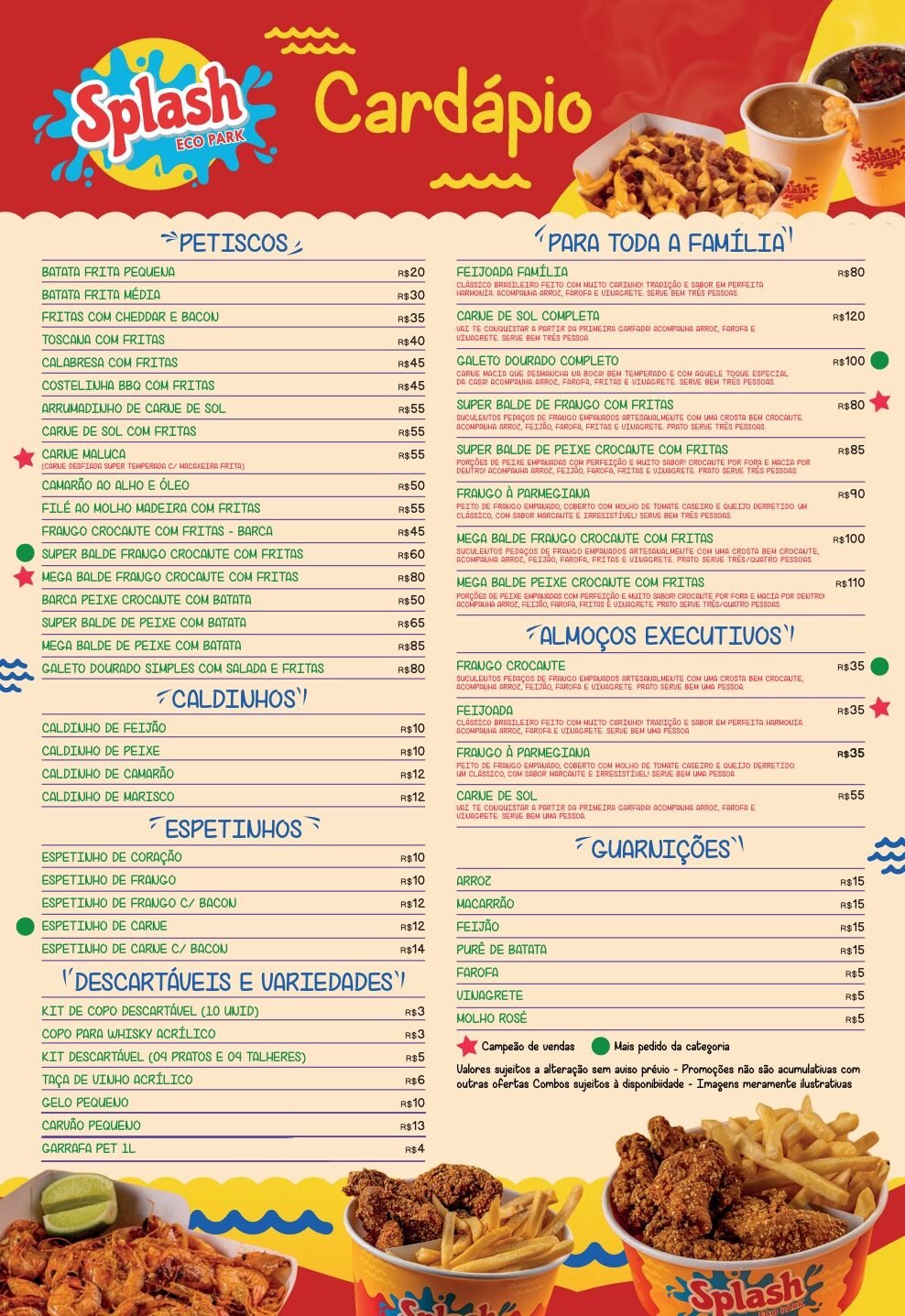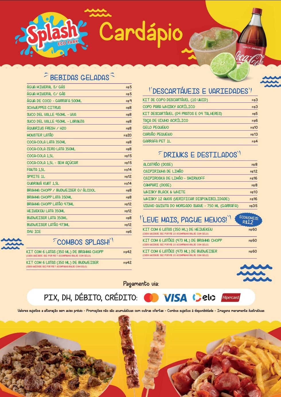 • RESTAURANTES: Pratos executivos; Refeições para 3 pessoas; Caldinhos e espetinhos; Petiscos; Refrigerante lata; Cervejas em lata (Amstel, Kaiser e Bavária); Latão; Heineken Lata; Refrigerante litro; Refrigerante lata 350ml; Whisky Black White.